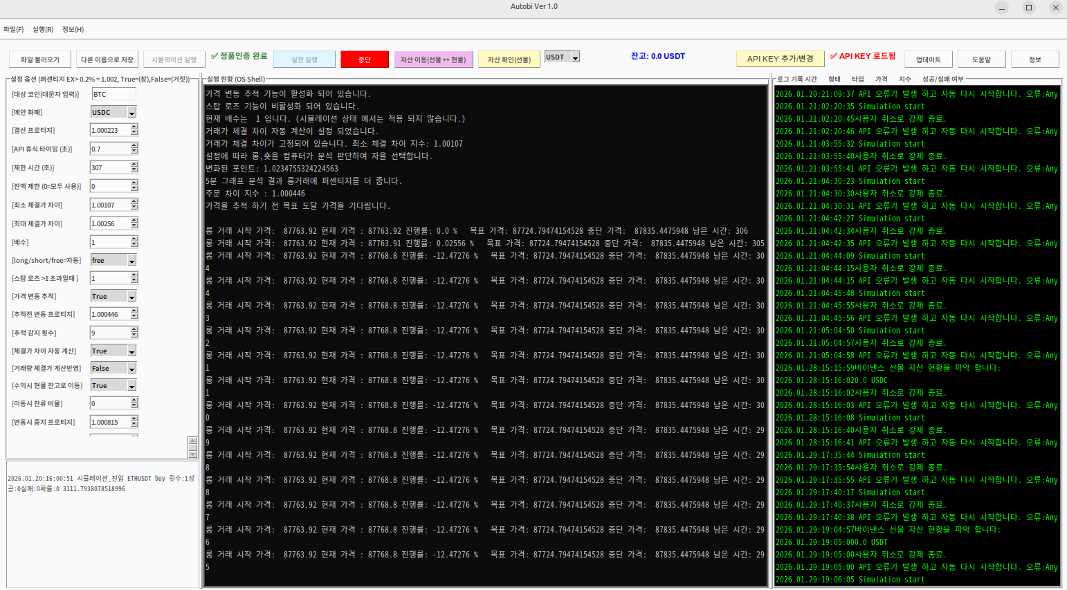 프로그램 사용자 당사자가 스스로 옵션 값을 정하여 자동매매를 진행하는 방식이며 실시간 현황 및 로그 기록 및 API오류 방어 대책 프로세스도 갖추고 있습니다. (100% 는 아님!)
